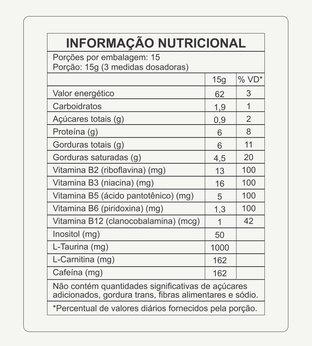 Dissolva 15g (3 scoops) em 100ml de água ou leite quente e aproveite sua energia durante o dia! Pode ser consumido uma vez ao dia ou conforme orientação de um profissional de saúde.